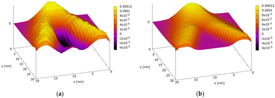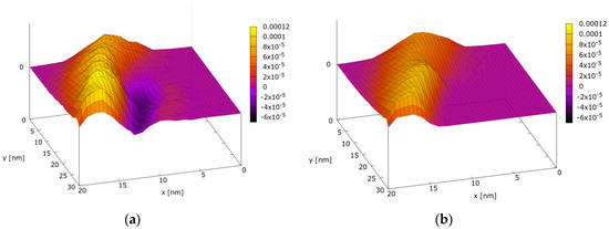 Comparison between quantum and classical sum of the phase-space distributions in the points (kx1, ky1) = (−0.26 nm−1, 0.89 nm−1) and (kx2, ky2) = (0.26 nm−1, 0.89 nm−1): (a) quantum Wigner distribution, (b) classical Boltzmann distribution.