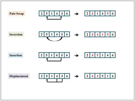 VNS [23] is a local search strategy used to improve metaheuristic methods. VNS can be used to maintain the diversity of solutions throughout the metaheuristic process. Four common neighborhood perturbation operators are adopted in VNS: pair-swap, inversion, insertion, and displacement. These are described as follows::
