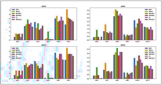 The best BRPD and ARPD values of the tested NEH-based algorithms were 1.88 and 2.18, respectively. From the aforementioned simulation results, it can be concluded that the CSA combined with the NEHLJP1 heuristic is more effective than other NEH-based heuristic algorithms. In addition, the original NEH algorithm had better ARPD values than the NEHD and NEHKK1 variants. Therefore, we incorporated NEHLJP1 into the CSA algorithm as the initialization strategy. To present the previous experimental results more clearly, the data from Table 5 are depicted visually in Figure 3. The x-axis shows the different sizes of the benchmarks, and the y-axis shows the ARPD and BRPD values for each test function.