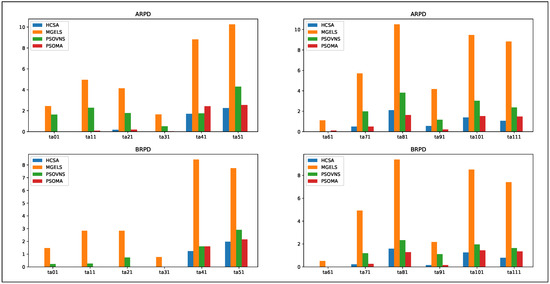 As shown in Table 8 and the values in bold font represent the algorithms that achieve superior performance. In terms of the BRPD values, the HCSA was superior to the MGELS, PSOVNS, and PSOMA algorithms, except for ta081 (100*20). In terms of the ARPD values, the HCSA was better than the MGELS, PSOVNS, and PSOMA algorithms, except for ta081 (100*20) and ta091 (200*10). The average ARPD value from HCSA was 0.61%, in comparison to the values of 6.00%, 2.05%, and 0.90% obtained by MGELS, PSOVNS, and PSOMA, respectively. In addition, because MGELS does not apply any initialization algorithm or local search, its performance had significant differences from other algorithms for large benchmarks. For the local search, using an SA-based search with the metaheuristic algorithm achieved better results than not using SA. In summary, from the aforementioned simulation results, it can be concluded that HCSA is more effective than the MGELS, PSOVNS, and PSOMA metaheuristic algorithms. To present the previous experimental results more clearly, the data from Table 8 are depicted visually in Figure 4. The x-axis shows the different sizes of the benchmarks, and the y-axis shows the ARPD and BRPD values for each test function.