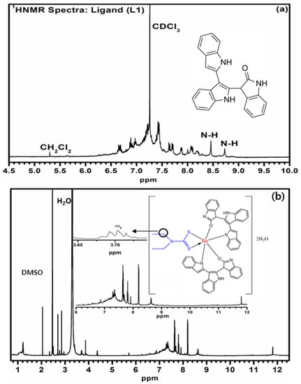 1HNMR spectra of the (a) ligand, L1 and (b) mixed ligand Cu (II) complex.
