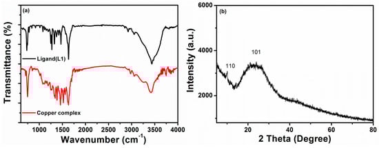 (a) FTIR spectra of organic ligand (L1) and Cu (II) complex and (b) powder XRD plot of mixed ligand Cu (II) complex.