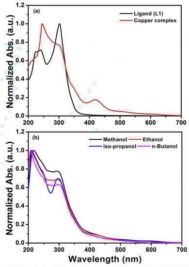Electronic spectra (Figure 3a) of the ligand (L1) showed two absorption peaks in chloroform. The broad peak around 220–246 might be assigned to the π-π* transition with a sharp peak at 302 nm to the n-π* electronic transitions. For the metal complex, three distinct absorption peaks were obtained in the chloroform solution. The high-intensity peak at 246 nm and a sharp peak at 300 nm corresponded to π-π* transitions and n-π* transition peaks of the organic ligand, which show a slight decrease in wavelength after metal complex formation. Additionally, the peak at 350 nm has been observed for the ligand to metal charge transfer (LMCT) transitions while the broad peak at 420 nm might be assigned to charge transfer transition (2Eg→2T2g) due to the Jahn-Teller distortion of the geometry of the Cu (II) complex [31]. The obtained metal complex has shown strong solution stability in DMSO and DMF under the UV–Vis bands for a week. The electronic spectrum of the complex has shown a sharp peak at 217 nm and charge transfer (CT) peak at 293 nm in methanol. The intensity of the CT peak increased upon irradiation by UV light at 25 °C without any other changes in the visible spectra of the Cu (II) complex [32]. The effects of various alcoholic solvents (Figure 3b) on the electronic spectra of the synthesized Cu (II) complex were also studied at the room temperature. Upon increasing the alkyl chain of the corresponding alcohols (ethanol to butanol), the slight blue shift in the peaks (211 and 207, respectively) and red shift in the peaks (295 and 298, respectively) were observed. However, the electronic spectra in isopropanol solution shows a peak at 209 nm and a distinct sharp peak at 297 nm [33].