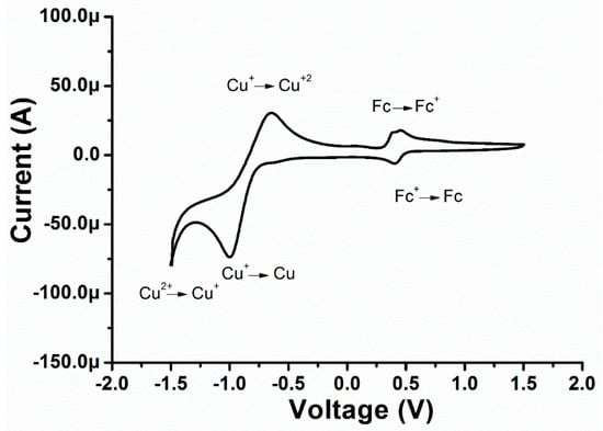 To explore the electrochemical properties (Figure 6) of the Cu (II) complex, cyclic voltammetry was employed in a three-electrode system. The cyclic voltammograms of Cu (II) complex were recorded at a glassy carbon electrode in CH3CN containing 0.1 M TBAPF6 as a supporting electrolyte in the potential range from −1.6 V to +1.6 V with a scan rate of 100 mV s−1. The Cu (II) complex shows three reduction peaks with Epa values of +0.412, −0.96, and −1.36 V vs. SCE. Hence, the irreversible reduction process of the Cu (II) complex leads to the deposition of Cu (0) on the electrode surface [35]. The peak potential (+0.412 V) might be attributed to the reduction of Fc+/Fc, whereas the peak potential (−1.00 V) can be assigned to the reduction of Cu+/Cu. Additionally, the third reduction potential (−1.36 V) might be ascribed to the Cu(II)/Cu(I) reduction process. During the reverse scan, three oxidation peaks of −0.64, +0.38, +0.47 V vs. Ag/AgCl were observed. The first peak (Epc −0.64 V) is associated with the oxidation peak of Cu (I)/Cu (II) while the second peak (+0.38 V) is associated with the ligand L1. In addition, the third peak is assigned to the reference redox couple of Fc/Fc+ [36].