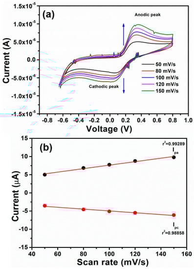 The cathodic and anodic currents increased with the increase in scan rate from 50 mVs−1 to 150 mV/s. Furthermore, the cathodic potential (Epc) is shifted towards more negative potentials, and the anodic potential (Epa) moved to more positive potentials with increasing scan rates towards the detection of chloride ions [37]. The plot of anodic and cathodic peaks versus scan rates (Figure 7b) has shown a linear dependence relation and hence suggests a quasi-reversible nature and diffusion-controlled transfer of electrons during the electrochemical reaction. The electrochemical system shows excellent retention coefficients (r2) of 0.99246 and 098866, respectively, which again deduces the good detection of chloride ions in neutral buffer electrolytes [38,39].