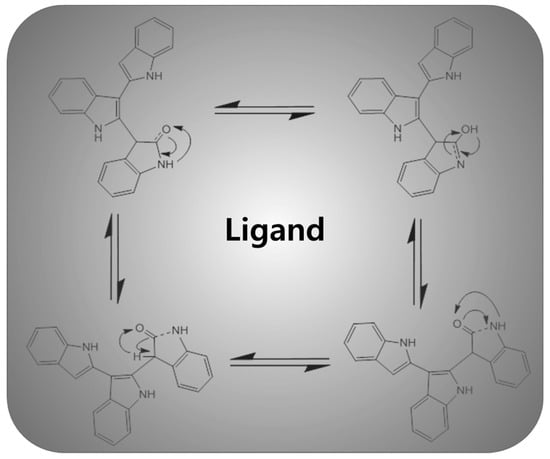 1H NMR spectrum (Figure 1a) of the synthesized organic ligand, L1, was observed in deuterated chloroform solvent and showed two singlet peaks at 8.4 ppm and 8.6 ppm, assigned to H–N–C=O cyclic ring. The singlet peak at 5.23 ppm is assigned to the C–H of dichloromethane which was used during the purification of L1. Additionally, the peaks of the aromatic protons of the ligand (L1) were observed in the range 6.67–8.42 ppm, while the doublet peaks appeared at 7.62–8.32 ppm corresponding to various benzene C–H protons. Moreover, the origin of the chemical shift at 8.5 ppm might be associated with the aromatic C–H in position 3 of the indole nucleus. The synthesized organic ligand, L1, exhibits delocalization of electrons through –NH and C=O groups to form tautomeric structures, as shown in Scheme 2. The signal in the range of 0.95–1.2 ppm has been observed for the methyl group of the coordinated diethyldithiocarbamate ligand (L2). The proton NMR spectra (Figure 1b) of mixed-ligand Cu (II) complex was observed in the deuterated dimethyl sulfoxide solvent with TMS as internal reference. The –CH2 protons of the diethyldithiocarbamate moiety is assigned at the 3.7 ppm (quadruplet) of the Cu (II) complex [26]. The O=C–NH proton has been assigned the strong signal at 3.36 ppm while attachment of third benzopyrrole moiety was observed due to the presence of a singlet peak at 4.34 ppm, hence a decrease in the chemical shift in the metal complex as compared to the organic ligand. The chemical shift values of other aromatic protons were observed in the region of 7.32–8.23 ppm for the metal complex alongside the peak at 8.72 and 11.65 ppm corresponding to the –NH proton of the cyclic benzopyrrole moiety [27].