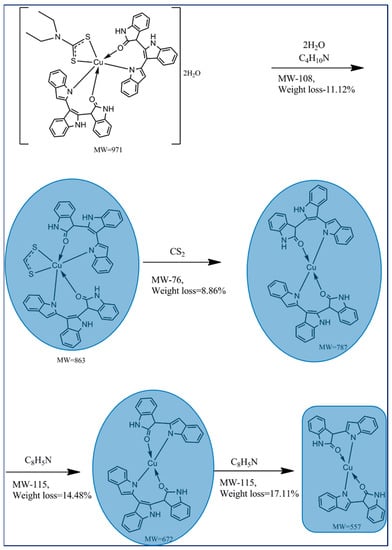 The thermogravimetric analysis (Figure 4a) of Cu (II) complex (empirical formula-C53H44CuN7O4S2) reveals the decomposition of water molecules around 115 °C. The Cu (II) complex showed its first decomposition (Scheme 3) around the temperature range of 100–160 °C with 11.12% weight loss which might be due to the loss of water molecules with the diethyl amine fraction of diethyldithiocarbamate ligand, L2. But the second decomposition of 8.88% weight loss in the temperature range of 160–234 °C occurred owing to the loss of the carbon disulfide (CS2) moiety of the remaining L2 ligand. The third decomposition of 14.61% weight loss was obtained in the temperature range of 240–392 °C, which corresponds to the partial loss of the C8H5N moiety of the organic ligand, L1. Finally, the fourth decomposition takes place around the temperature range of 395–465 °C due to the loss of the remaining organic ligand and metal oxide formation with carbon as residue [34]. The observed decompositions conform with the calculated values of Cu (II) complex and its mass percentage-derivative (Figure 4b) during thermal analysis under an inert atmosphere.
