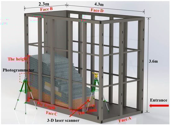 In this study, a large-scale 3-D container was created. The container was 4.3 m long, 2.3 m wide and 3.6 m tall (Figure 3). Face A of the container is open for researcher’s access, while face B is closed. Faces C and D are made of high-strength plexiglass, through which the in-plane deformation of a model slope can be imaged by 3-D laser scanner and photogrammeter. Face C of the model container is a vertical section along the centre of the veins (refer to Figure 1), and the strata and surface movement in this section can be observed. To track the deformation, observation points can be marked on the plexiglass. Then, a high-resolution camera can be used to obtain the location of each of these points during the simulation of mining process. Hence, a displacement field of this section can be calculated for interpretation.