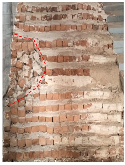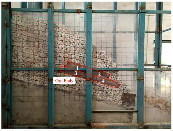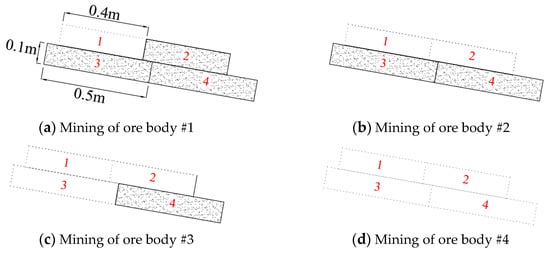 The instability of the model slope was introduced by modelling sequences of mining processes. Based on the site information, the ore body was approximately located at 0.75 m away from the top surface of the slope, and it had a length of 1 m, a width of 0.4 m and a thickness of about 0.2 m (Figure 2 and Figure 6). The ore body was composed of four individual sandbags. The simulation of mining process was divided into four steps by sequentially removing the sand from each bag following the order shown in Figure 6. This is a new modelling approach that is more advantageous over the existing methods, where blocks or PVC pipes were often used to replace an ore body and the mining process was simulated by an extraction of these blocks or pipes at one time [28,29,30,31,32]. The whole process of deformation and failure mode of the strata could be identified and investigated by the new method.