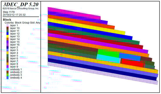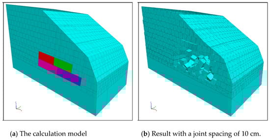 With regard to the first objective, analysis to the influence of joint spacing on rock slope failure induced by mining was conducted to determine a critical joint spacing (), which would be practical for modelling in the model container, while not compromising the deformation and failure characteristics of the mine in prototype scale. Eleven rock slope models that have the same geometry to the physical models were created in the software (Figure 7). The dimension of the numerical model is also with a length of 2.3 m, width of 1.5 m and height of 2.0 m, the numerical model is composed of 8747 elements and 10373 nodes. In all the analyses, the constitutive model used is Mohr-Coulomb failure criterion model. The rigid stress-strain constitutive criterion is applied to the materials. A range of joint spacing between 5 cm and 10 cm (0.5 cm interval) was examined to investigate its effects on discrete element modelling (DEM) analyses were conducted to determine a representative joint spacing used for physical model tests. In this analysis, different numerical slope models having different joint spacings were constructed in the DEM software, 3DEC, for predicting the slope corresponding strata and surface movements when having different values of joint spacing. The input parameters of rock mass and rock joints are summarised in Table 4 and Table 6, respectively. The horizontal direction (X) of the eastern and western boundaries, as well as the horizontal direction (Y) of the southern and northern boundaries of the model slopes were all fixed boundaries. On the other hand, the bottom boundary was also set fixed in the vertical direction (Z). No mechanical constraints were applied to the surface of the model (i.e., free to deform). In each analysis, the slope was subjected to the identical mining methods and procedures as in the physical model tests. Four blocks having the same size of the sandbag were set void sequentially (following Figure 6), to simulate the process of sand removal and hence unloading.
