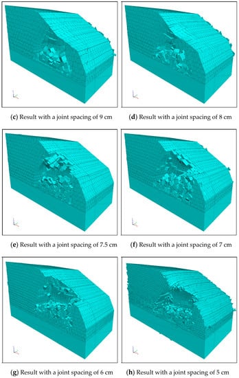 Results of numerical analysis at different joint spacing; (a) model setup; (b) 10 cm; (c) 9 cm; (d) 8 cm; (e) 7.5 cm; (f) 7 cm; (g) 6 cm; and (h) 5 cm.