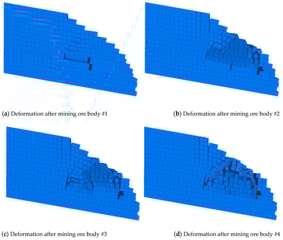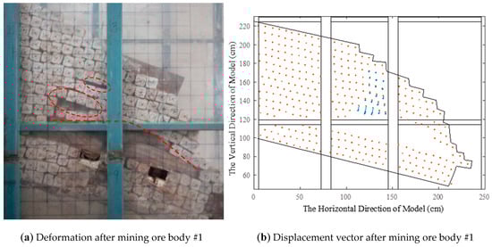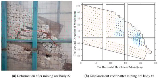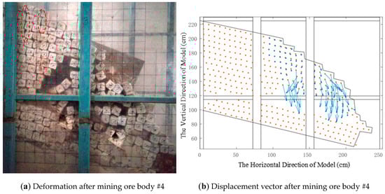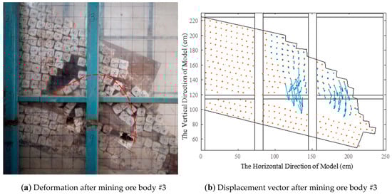 The observed deformation and displacement vector after each stage of mining simulation are shown in Figure 9, Figure 10, Figure 11 and Figure 12. After mining the ore body #1 (see Figure 9), the blocks that were right above the mining area collapsed and fell off, as expected, due to the loss of support. Then, the strata overlying this layer of blocks underwent a substantial downward movement, which caused separation of the overlaying strata along the flat joints. There was no change in the shape of slope surface possibly due to the formation of arching mechanism within blocks (Figure 9a), Figure 9b also shows that the strata deformation has not transferred to the slope surface. After mining the ore body #2 (Figure 10), the strata deformed further towards the open area created by the previous step of mining process. The strata right above this area of mining collapsed almost vertically, introducing significant subsidence pit on the slope surface. This mining process did not introduce any surface subsidence near the crest of the model slope, but the strata deformation transferred to the slope surface (Figure 10b). After mining the ore body #3 (Figure 11), the strata right above the mined area was extensively fractured and more blocks right above collapsed. An arch was formed to support the blocks away from the mined area (Figure 11a). Although there was little or no surface subsidence near the crest of the slope, two rock joints were expanded laterally in size, forming two prominent vertical cracks in this slope section. A toppling avalanche was found near the toe of the slope. The surrounding blocks displaced toward the mined area, and local sliding occurred along the slope surface right above the ore body #3. Finally, after mining the ore body #4 (Figure 12), the strata above the mined area collapsed further, though interestingly, the arch formed in the previous stage of mining remained intact and was apparently unaffected by this last stage of mining (Figure 12a). Substantial amount of rock mass was fallen into the mined area, resulting in large slope surface subsidence at middle of the slope. Blocks near the subsidence pit experienced intensive disturbance and started to slip along the flat joint surface. At the end of the mining processes, a subsidence pit was formed right above the mining area (Figure 13) due to the significant vertical downward movement of strata. Due to the existence of predominant joints, the observed failure mode differs from the trumpet-shaped subsidence experienced in slopes made of unconsolidated soil [30].