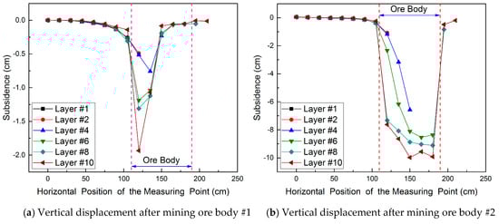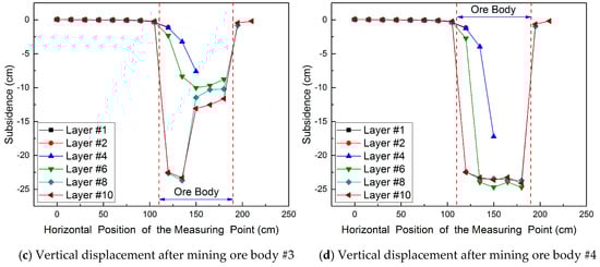 Figure 14 illustrates the process of mining induced strata movement obtained by numerical simulation, which is basically consistent with the physical modelling test result. The main deformation phenomenon reappeared in numerical simulation, though the internal displacement of the rock mass is not obtained by physical modelling, the displacement obtained by numerical simulation is consistent with the displacement vector graph in the physical modelling test and can support the phenomenon of strata movement obtained by physical modelling. Displacement monitoring points are set in ten strata from the first strata directly above the mined area to the slope surface (layer 7, 8, 10, 12, 14 and 16 illustrated in Figure 7), and the horizontal spacing of these monitoring points is 15 cm. Figure 15 shows the vertical displacement of the strata directly above the mined-out area, and the displacement value is built up with the mining. The maximum displacement will always appear in the strata that are directly above the mined area, which indicates that mining-induced unloading triggered the strata movement. All the displacement curves of the four mining steps tell us that a significant increase in displacement began to appear near the boundary between the mined area and surrounding rock, which indicates that due to the existence of steep joints, the rock mass deformation transferred mainly upward to the slope surface. The final well-shaped displacement curve also indicates a well-shaped rock mass subsidence.