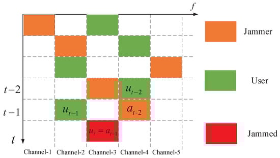 In order to improve the jamming effect, anti-jamming methods are needed to take into consideration when we design a jamming method. There are many kinds of anti-jamming methods [,,], such as frequency hopping [], fixed frequency with a greater communication power [], direct sequence spread spectrum (DSSS) []. In [], link-layer jamming and the corresponding anti-jamming methods are overviewed. Link-layer jamming can analyze the user’s Media Access Control (MAC) protocol parameters, and releases a high energy-efficiency jamming attack. In addition to the adversarial jamming, we can also utilize the cooperative jamming techniques to improve the physical-layer security []. In order to face the developing of anti-jamming, many researchers use optimization, game-theoretic or information theoretic principles to improve the jamming performance [,,,]. However, these methods require some prior information (the communications protocol, user’s transmission power, etc.) that is difficult to obtain in the actual environment. Other researchers solve the jamming problem with repeatedly interacting with the victim transmitter-receiver pair [], combining optimization, game-theoretic theories and other theoretical tools. But these only take the situation that the user has a fixed strategy into consideration, or choose a strategy from a strategy set. It is difficult to design the efficient jamming strategy when facing an intelligent user that could change communication strategy by learning [].