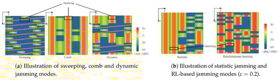 Figure 4a shows the spectrum waterfall of the first three jamming modes where the horizontal axis represents frequency and the longitudinal axis represents time. The simulation results of them combating with a DRL-based anti-jamming method can be seen in []. The patterns of jamming based on statistics and RL were dynamically changing according to user’s signal, which can be seen in Figure 4b.