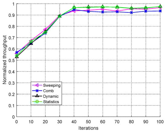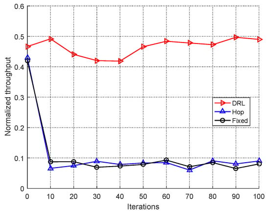 In order to investigate the performance of DRL-based anti-jamming algorithm and verify the theoretical analysis in Section 4, we let the DRL-based users combat different kind of jammers. In Figure 5, the horizontal axis represents cumulative iterations. Each iteration indicates 2 s (200 times) of the users’ communication. The longitudinal axis is the normalized throughput in one iteration. In Figure 5, four kinds of jammer jam DRL-based user. It can be seen that in the face of four types of jamming, DRL-based user can almost perfectly avoid the jamming signal after training.