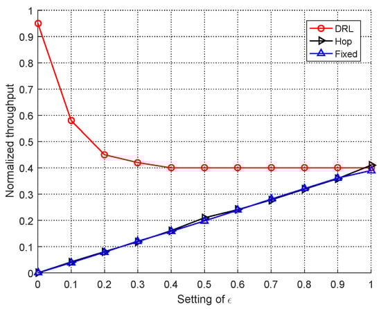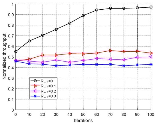 In order to illustrate the effect of randomness on the DRL-based anti-jamming algorithm, Figure 6 shows the throughput against RL-based jammer with different . As we can see in Figure 6, if the RL used a greedy strategy () completely, after 50 iterations the jammer failed. As increased, the performance of DRL anti-jamming dropped dramatically. The deep neural network did not converge due to the randomness, which caused the failure of DRL-based user to learn the pattern of RL-based jamming. From the right of Figure 4b we can see that DRL-based method gets jammed with high probability in face of RL-based jamming.