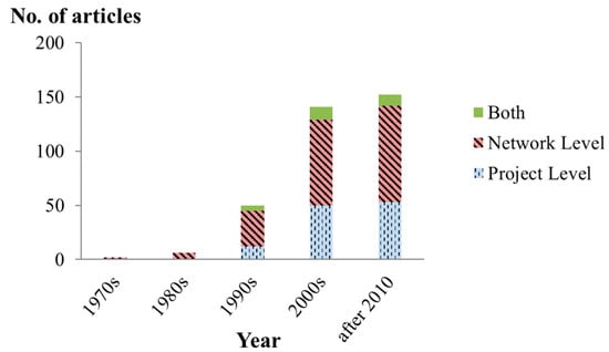 As shown in Figure 2, among the reviewed articles, the majority of them study network-level decision making, while considerable amount of them are at the project level. Some articles consider both levels in their DM. The numbers of both project- and network- level DM are increasing with the growth of research interests in this field, though the network-level DM has a faster speed. It is important to notice that the discussion on M&R management is a dominating subject among the reviewed articles and most of the recent articles focus on the network-level DM, while the research on other management, e.g., update, often use the project-level DM. In terms of M&R management, project-level DM is often used to analyze a special project when the infrastructure, e.g., a bridge, is very important, when a complex model is established, or when complicated outcomes are analyzed [21,22,23]. Network-level DM considers not only the entire network but also analyzes the individual segments. It produces a management plan/strategy for each segment through the analyzed period so that the whole network can satisfy its management goal and requirements. It is more helpful when managing a network of infrastructure [24,25].