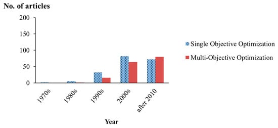 Figure 4 presents the application number of SOO and MOO on this subject. According to this figure, SOO was applied first and dominated in this field before the 2010s. Often a main management goal is defined as optimization objective and other goals and requirements are converted to optimization constraints. The commonly used SOO model is to minimize the M&R cost subject to the acceptable worst condition [26,27,28] or to improve the condition/condition-based benefit, subject to an annual budget [29,30,31]. By reviewing the articles, this paper finds out that, today, a considerable amount of articles still use SOO for their DM in IAM, while its orientation is moving to the hard DM problems, including huge networks [32,33], life-cycle analysis [34,35,36], complex non-linear models [37,38,39], and cross-assets [40,41].