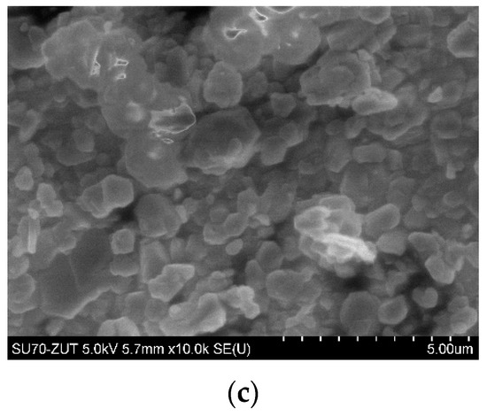 Figure 1 displays scanning electron microscopy (SEM) images of HNTs (a), modified HNTs with gelatin (b), and silane-modified ATH (c). As one can see in SEM images (a) and (b) the surface of the modified HNTs with gelatin became rough compared with the raw HNTs. Therefore, the results demonstrated that gelatin was successfully grafted on the surface of HNTs. The SEM image (Figure 1a) of HNTs reveal that the majority of HNTs existed in a tubular shape. The presence of short tubular HNTs, semi-rolled HNTs, and sheet-like HNTs were visible. A mean particle size of ca. 1.5 μm and lengths ranging from 500 nm to 3 μm were determined. In turn, the morphology of the as-received silane-modified ATH observed by SEM (Figure 1c) was similar to the ones obtained from the manufacturer and provided in the technical data sheet. Particles were not uniform in shape and they exhibited an almost smooth surface.