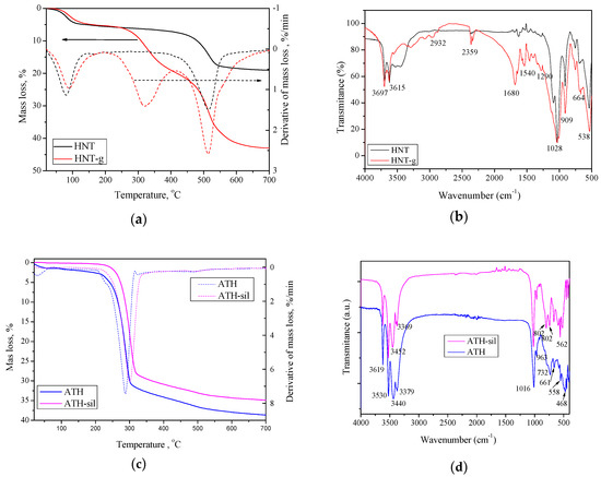 TG curves (a) and FTIR spectra (b) of pristine HNTs and gelatin-modified HNTs; TG curves (c) and FTIR spectra (d) of pristine ATH and silane-modified ATH.