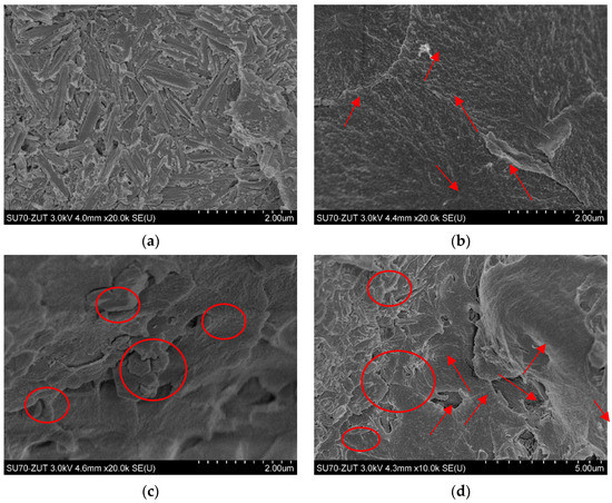 SEM micrographs of fracture surfaces of the composites containing: 5% HNT (a); 5% HNT-g (b); 5% ATH-sil (c), and 2.5% HNT-g + 2.5% ATH-sil (d).