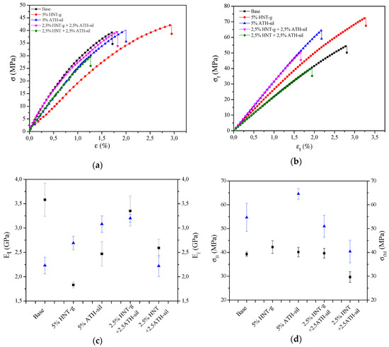 Representative stress–strain curves for the series polymer nanocomposites recorded during static tensile test (a) and static bending test (b); comparison of the values of elastic and flexural moduli (c) and stress at break and flexural strength (d) for polymer nanocomposites in relation to the base material.