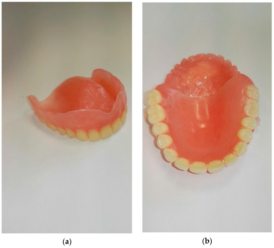 The image of the prepared dental prosthesis made from hybrid composite: base + 2.5% HNT-g + 2.5% ATH-sil, view of the upper (a) and lower part (b) of the complete denture prosthesis.