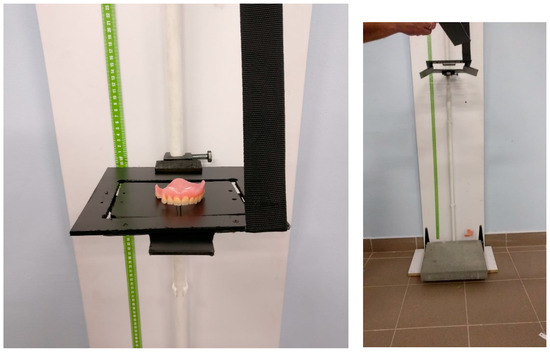 Moreover, from the obtained composite materials, one has prepared dental prostheses (Figure 5). Finished products were subjected to a fall test from a height. This trial was a simulation of the fall and permanent damage of the dental prosthesis that happens frequently (on average three times a year for one patient—data provided by the Department of Dental Prosthetics, Pomeranian Medical University in Szczecin—analyzed group: 1500 people), especially in geriatric patients. The fall test from the height was carried out on a self-constructed stand (Figure 6) utilizing inertial force. Three dentures made of the materials presented in Table 3 were selected for the fall test from height. This table also contains numerical values of cracks for each group of materials, which were recorded by analyzing the denture surface with a stereological microscope at a fall from 50, 100, and 150 cm. The height values were adjusted to the actual conditions of use of the dental prosthesis by the patient and, in the opinion of the authors, were sufficient.