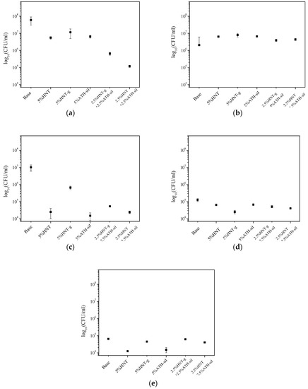 Analysis of the impact of the base material and the prepared composites against the following strains: C. albicans (a), S. aureus (b), P. aeruginosa (c), E. faecalis (d), and E. coli (e)—quantitative method.