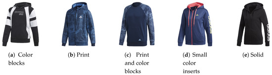 Colors, instead, do not have a precise accuracy value, since both the color names and the coverage percentage are subjective attributes. On the contrary, the color module in combination with the prints and three-stripes classifiers gains measurable results. In the first case, the color module has to recognize the type of “composition”, choosing among SOLID, COLOR BLOCKS, and SMALL INSERT classes, as outlined in Section 3 and in Figure 5. On the 213 not-printed products recognized using the prints classifier, as in Table 6, the overall accuracy is . The confusion matrix and class frequencies are shown in Table 10.