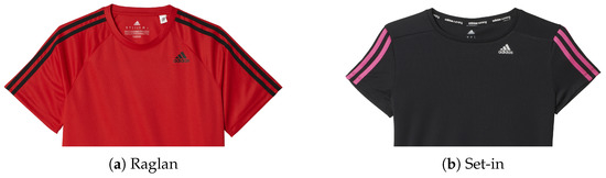 Figure 4. In “raglan” shirts, the junction between the body and the sleeves starts from the armpits and goes to the neck; the term “set-in”, instead, refers to those shirts that have the sleeves sewn with the body of the garment with a vertical closure. - Material of the clothing. Clothes have a lot of fabric types, but at this stage (recognition from final renderings), only cotton, (generic) synthetic, and viscose fabrics have to be distinguished.