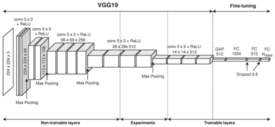 Two classifiers for medium and large sized logos are developed using a fine-tuned CNN. Both classifiers output the type of logo found—not the size—and thus the size is deduced from which one of these two classifiers activates. The main idea of fine-tuning is to train a deep neural network that has already been trained on a certain dataset, which could be or could not be relevant in the application domain, e.g., the dataset for pre-training could contain images that are very distant from the fashion context. In this work, the CNN used is the VGG19 one, and some experiments were made also with the VGG16, as detailed in Section 6. The reason for choosing VGG19 above other deep networks resides in an empirical evaluation of its accuracy compared to some of the most popular networks (such as InceptionV3, ResNet50, and so on), on the specific Adidas dataset. Results, reported in Section 6, show that the maximum value of the validation accuracy is achieved using a fine-tuning on VGG19. Moreover, VGG19 is a rather simple network—it has a very straightforward topology—and uses kernels instead of those kernels used in the standard approach for large scale recognition, thus reducing substantially the number of parameters (weights and biases).