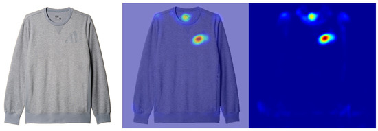 These added layers, together with the last ones of the base model, were the ones responsible to recognize more specific and elaborated features inside the input image, namely, logos themselves or part of them. The fact that layers increased the complexity of recognized features as the depth of the network increases was helpful in the development phase. As a matter of fact, this step allows us to extract some evaluation parameters for each layer, and to represent them by means of heatmaps, i.e., images that show which parts of the input image have been triggered at each layer. Figure 7 shows the heatmap obtained by the neuron activation values of the GAP layer, which is placed after the last convolutional layer of the network. The figure shows the original image, the overlap between the image and the heatmap, and the extracted heatmap.