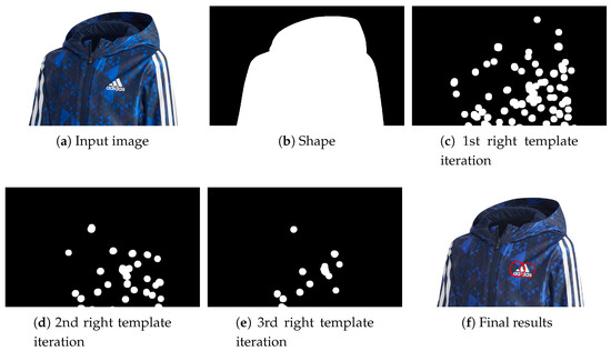 The relevant region of the input image consists initially in the entire visible area of the garment in the image, obtained in the preprocessing phase: in fact, the binary image that represent the shape of the apparel product has value 0 on the background, and 1 otherwise. The initial template matching is performed on a downsampled grayscale version of the input image. The initial downsampling factor is 16. Equation (2) is computed for each pixel of coordinates in the search region, for each transformation of the template. It is worth noting that . Such a score has an immediate interpretation: a value close to 1 means a strong correlation between the portion of the input image and the template, whilst a value close to an inverse correlation. Since logos could have different backgrounds and colors, both correlation and inverse correlation denote a good match. In our approach, the PCC value is then transformed into a probability, between 0 and 1. A threshold is applied to find the most probable matching. Applying a threshold returns a set of regions, and these regions are used in the following step of the algorithm to perform the successive matching. Simultaneously, the downsampling on the input image is reduced to a factor of 8 in the second iteration and 4 in the third. Such an iterative process is repeated no more than three times in our system, in order to avoid high computational times. At the end of the iterative process, the remaining search regions become the regions where the logo was found, and a circle is drawn over it to indicate its position. Figure 8 shows the procedure for finding a small logo using PCC. Only the matching with the right-hand side of the logo is detailed, but the last image shows the results of both searches (LHS and RHS). In this case, the logo is clearly visible, but it could be confused with the background pattern: in fact, the first iteration of PCC in Figure 8c retrieves several false positives.