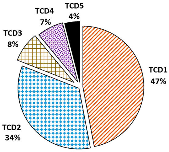 Figure 1 shows the number of cases by types of construction deficiency. The type with the highest number of cases was ‘localized infiltration’, with 355 cases (TCD1 = 47%), followed by ‘moisture by infiltration’, with 263 cases (TCD2 = 34%).