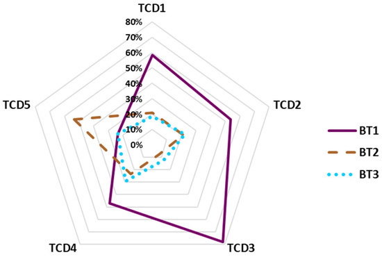 In the general distribution by type of deficiency, there is a high presence of ‘localized infiltrations’ (TCD1 = 47%), followed by ‘moisture by infiltration’ (TCD2 = 34%). The results by building typology show that, most of the time, problems occurred in ‘apartment blocks’ (BT1 = 56.23%), with this typology being predominant in all types of deficiencies studied, except for ‘fissures in gable-walls and slab faces’ (TCD5), which are far more common in ‘detached houses’ (BT2): TCD5BT2 = 53.33%.