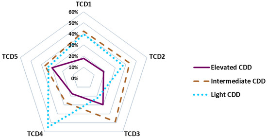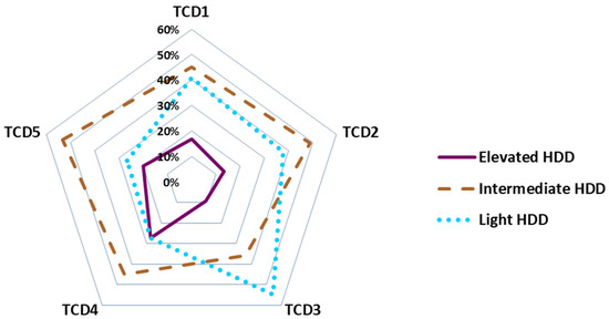 Figure 3 shows the number of heating degree days (HDD) for each roof deficiency found in the research, classified according to Table 2. It can be seen that geographical zones with elevated heating demand have a lesser percentage of presence—by type of deficiency—in all construction deficiencies analyzed, with the exception of ‘condensation moisture’. It can also be seen that there is a higher presence in geographical zones with an intermediate heating demand (between 1800 and 2800 degree days), except for ‘Fissures in brick parapets’ (TCD3), which have a higher probability of taking place in conditions of light thermal demands. It is also observed that, in zones with an intermediate heating demand, the probability of the appearance of ‘fissures in gable-walls and slab faces’ (TCD5) is increased.