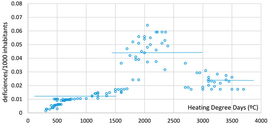 Figure 4 shows the trend analysis of the number of deficiencies per 1000 inhabitants by number of heating degree days of the building location. A higher percentage of deficiencies is found in those geographical zones where there is a thermal demand of between 1800 and 2800 heating degree days.