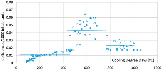 The trend analysis in Figure 6 relates the number of deficiencies per 1000 inhabitants with the number of cooling degree days of the building location. A higher percentage of deficiencies is found in those geographical zones where there is a thermal demand of between 450 and 700 cooling degree days.