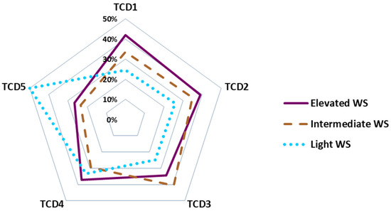 Figure 7 shows the average wind speed for each roof deficiency identified during the research, classified according to the wind speed, based on Table 2. It can be seen how high wind speed (WS > 3 m/s) increases the percentage of presence of all analyzed deficiencies, except in ‘Fissures in gable-walls and slab faces’ (TCD5), in which the opposite effect takes place. Specifically, it is observed that ‘localized infiltrations’ (TCD1) and ‘moisture by infiltration’ (TCD2) are increased in proportion to wind speed. It is also observed that ‘fissures in brick parapets’ (TCD3) occur less frequently under light wind speed.