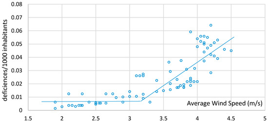 Figure 8 shows the trend analysis of the number of deficiencies per 1000 inhabitants by wind speed of the building location. It is found that an annual average wind speed greater than 3 m/s increases the probability of the appearance of deficiencies in roofs.