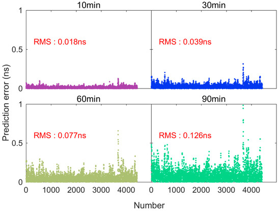 To determine the accuracy of the clock offset prediction, 4400 tests were performed. The predicted error was for 10, 30, 60 and 90 min prediction periods. The prediction error of the adaptive clock prediction model at station BRUX is exhibited here in Figure 4 due to the limited space. Furthermore, the root mean squares (RMS) of the predicted errors are presented in Table 3. Taken together, we make three observations. First, the prediction error is extremely stable, which further explains the reliability of the adaptive clock prediction model. Second, considering the RMS values of the prediction error, they follow an order of increasing trend when the prediction period ranges from 10 min to 90 min, thereby indicating that our approach for short-term data interruption will obtain better results, but that this is not the case for long-term data interruption. We do not conceal this restriction. We recommend that the clock offset parameter be reinitialized if the data is interrupted for a long period. Third, the prediction accuracy of all the stations present similar qualities for the same prediction periods. Hence, the variance values will be set from a prior variance in this contribution.