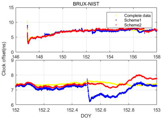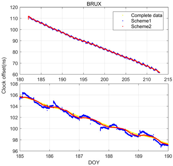 Figure 10 and Figure 11 show, first, that the clock difference time series of scheme 2 is smoother than that of scheme 1. Second, the non-convergence caused by the observation interruption occurs in scheme 1, causing the appearance of a system error. It influences the stability of the time link. Third, the tendency of scheme 2 is in accordance with the complete data, i.e., the data show that scheme 2 avoids re-convergence when the data are interrupted. The data show that scheme 2 works well for the real time data and for the simulation data.