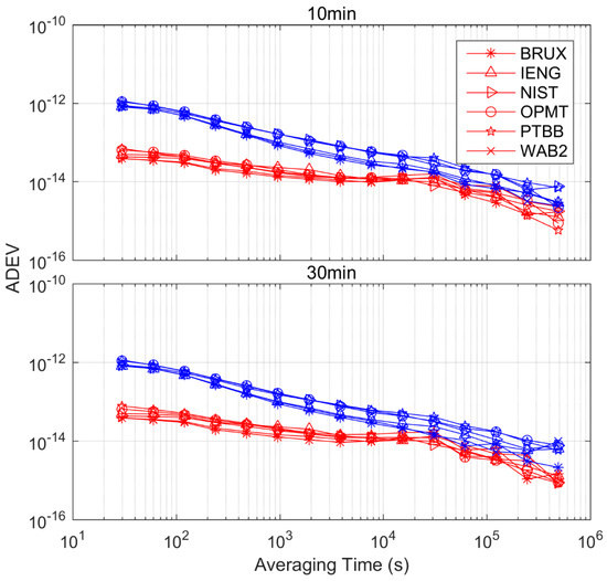 Allan deviation of scheme 1 (blue) and scheme 2 (red) at six stations for observation interruptions of 10 and 30 min.