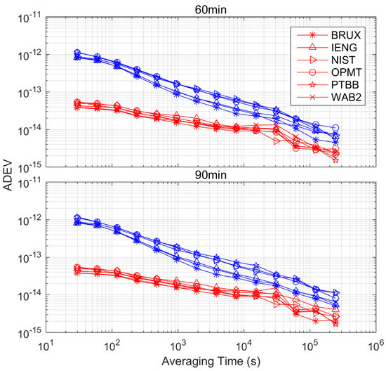 Allan deviation of scheme 1 (blue) and scheme 2 (red) at six stations for observation interruptions of 60 and 90 min.