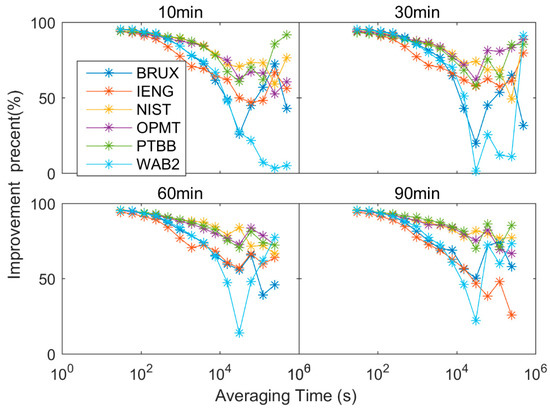 The inspection of Figure 9 can reveal more about the improvement of the frequency stability at a specific averaging time. The data indicate that all the involved stations are improved at each averaging time. Furthermore, as the averaging time increases, the improvement percent decreases. Before 10000 s, the improvement extent of the six stations was up to 50% from data interruptions of 10 min to 90 min; some points even improved by 100%. However, after 10000 s, the improvement extent of the six stations fell below 50%; some points being at only 1%. Briefly, compared to scheme 1, scheme 2 works well for short-term stability. The Allan deviation is a common measure of the frequency stability. Although the definition for short-term stability and long-term stability is the same, they reflect different characteristics of the signal stability. Short-term stability mirrors the signal’s fluctuations, and long-term stability represents the signal’s drift as time goes by. The between-epoch constraint model merely lowers the noise of the clock offset time series; however, it cannot change the physical trend of the atomic clock. Hence, there are enough reasons to certify that the random-walk model is an effective approach for improving stability at each averaging time.