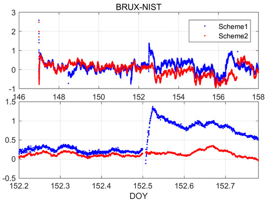 In Figure 5, each panel shows three types of time series of clock offset estimation with a time resolution of 10 min data interruption on BRUX. Other stations perform a similar feature; hence, we will no longer display them in detail. Furthermore, the clock difference in the time series of scheme 1 and scheme 2, with respect to the results of the complete data with the between-epoch constraint model, is displayed in Figure 6 for a data interruption of 10 min. Combining Figure 5 and Figure 6 results in two findings. For one thing, as we noted earlier, the clock offset will re-converge, especially for scheme 1, when the data interruption occurs. Obviously, the results from the complete data show some fluctuation (see Figure 6), as evidenced by the fact that the ambiguity parameters cannot instantaneously yield stable results, although we have constrained 20 consecutive epochs. Additionally, compared with the results from scheme 1, scheme 2 shows no obvious jump when the data interruption occurs. This can be explained by the fact that a prior clock offset is constrained by the prediction results.