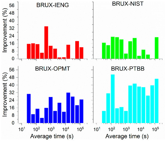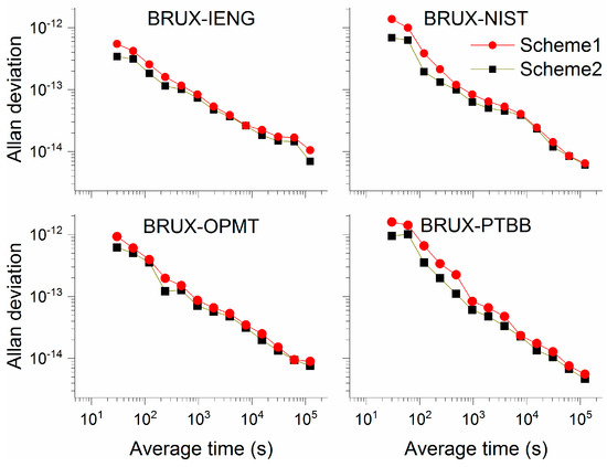 Figure 12 and Figure 13 illustrate more about the link stability. All the stations are equipped with an H-maser. The discrepancy in the different types of external frequency standard can be neglected. For the selected four links, the data show that the time series in scheme 2 is more stable than that in scheme 1. The maximum percentage of improvement is greater than 50%, while the minimal percentage of improvement is 5%. In other words, the frequency of stability is boosted at each averaging time, especially in the link BRUX-PTBB, where a distinct enhancement is demonstrated at each averaging time. The maximum percentage is greater than 50% at 100 s. A strong correlation may exist in the adjacent epoch for the PTB’s H-MASER. The application of the between-epoch constraint clock model makes full use of the correlative information to achieve more stable results. Moreover, the data show that the magnitude of the improvement is not correlated to the distance between the stations.