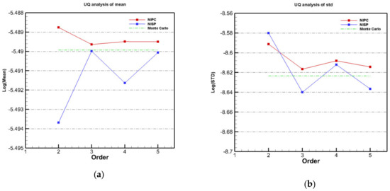 Similar to the convergence of the drag coefficient, the mean value of the lift coefficient converged early from the second order but the STD showed a large difference when the order was 2. At the fifth order, there was a 0.85% difference in point-collocation NIPC and 0.46% in NISP as shown in